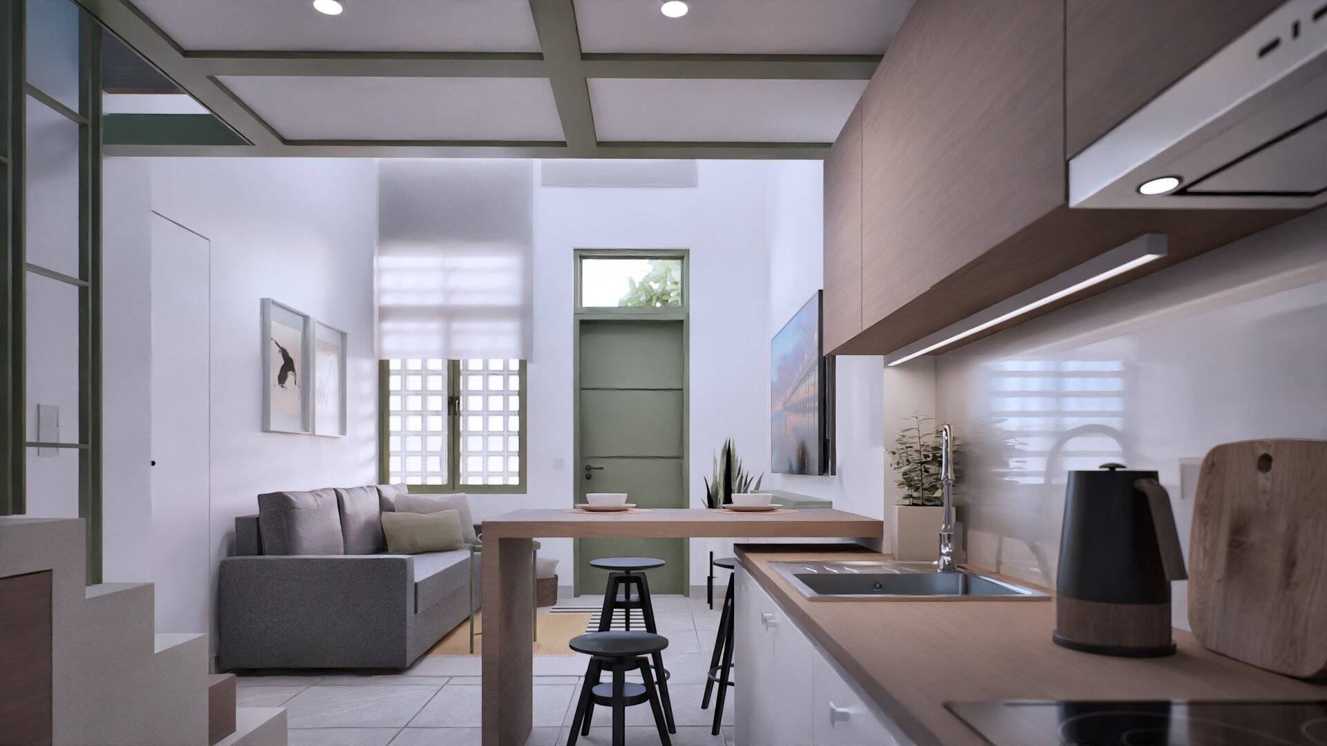 Στο εσωτερικό, ο χώρος υποδέχεται με φως και καθαρότητα. H λειτουργία οργανώνεται γύρω από τον χώρο διημέρευσης, με σαλόνι, κουζίνα και λουτρό. Η κουζίνα διαθέτει ξύλινα και λευκά ντουλάπια, καθώς και ξύλινο πάγκο με ενσωματωμένο τραπέζι, ενώ το σαλόνι ολοκληρώνεται με γκρι καναπέ και πράσινο τραπεζάκι. Στο λουτρό διατηρείται η καθαρότητα του λευκού, με ξύλινες λεπτομέρειες και πλακίδια γρανίτη σε δάπεδο και τοίχο αποπνέοντας αίσθηση φρεσκάδας και καθαρότητας.