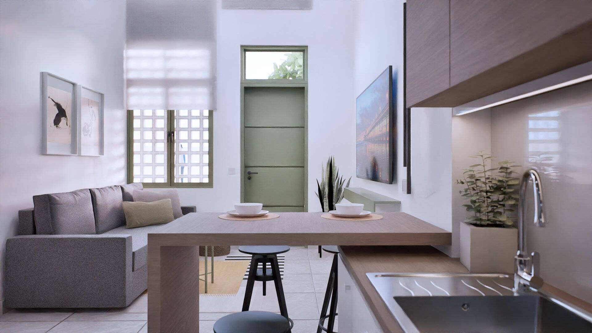 Στο εσωτερικό, ο χώρος υποδέχεται με φως και καθαρότητα. H λειτουργία οργανώνεται γύρω από τον χώρο διημέρευσης, με σαλόνι, κουζίνα και λουτρό. Η κουζίνα διαθέτει ξύλινα και λευκά ντουλάπια, καθώς και ξύλινο πάγκο με ενσωματωμένο τραπέζι, ενώ το σαλόνι ολοκληρώνεται με γκρι καναπέ και πράσινο τραπεζάκι. Στο λουτρό διατηρείται η καθαρότητα του λευκού, με ξύλινες λεπτομέρειες και πλακίδια γρανίτη σε δάπεδο και τοίχο αποπνέοντας αίσθηση φρεσκάδας και καθαρότητας.
