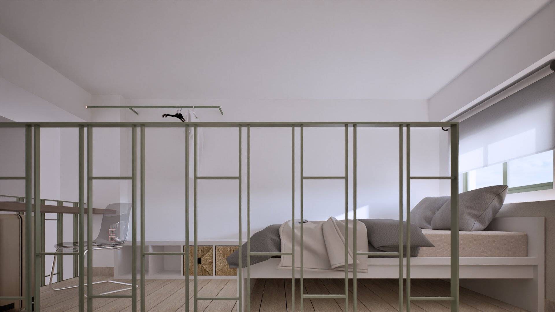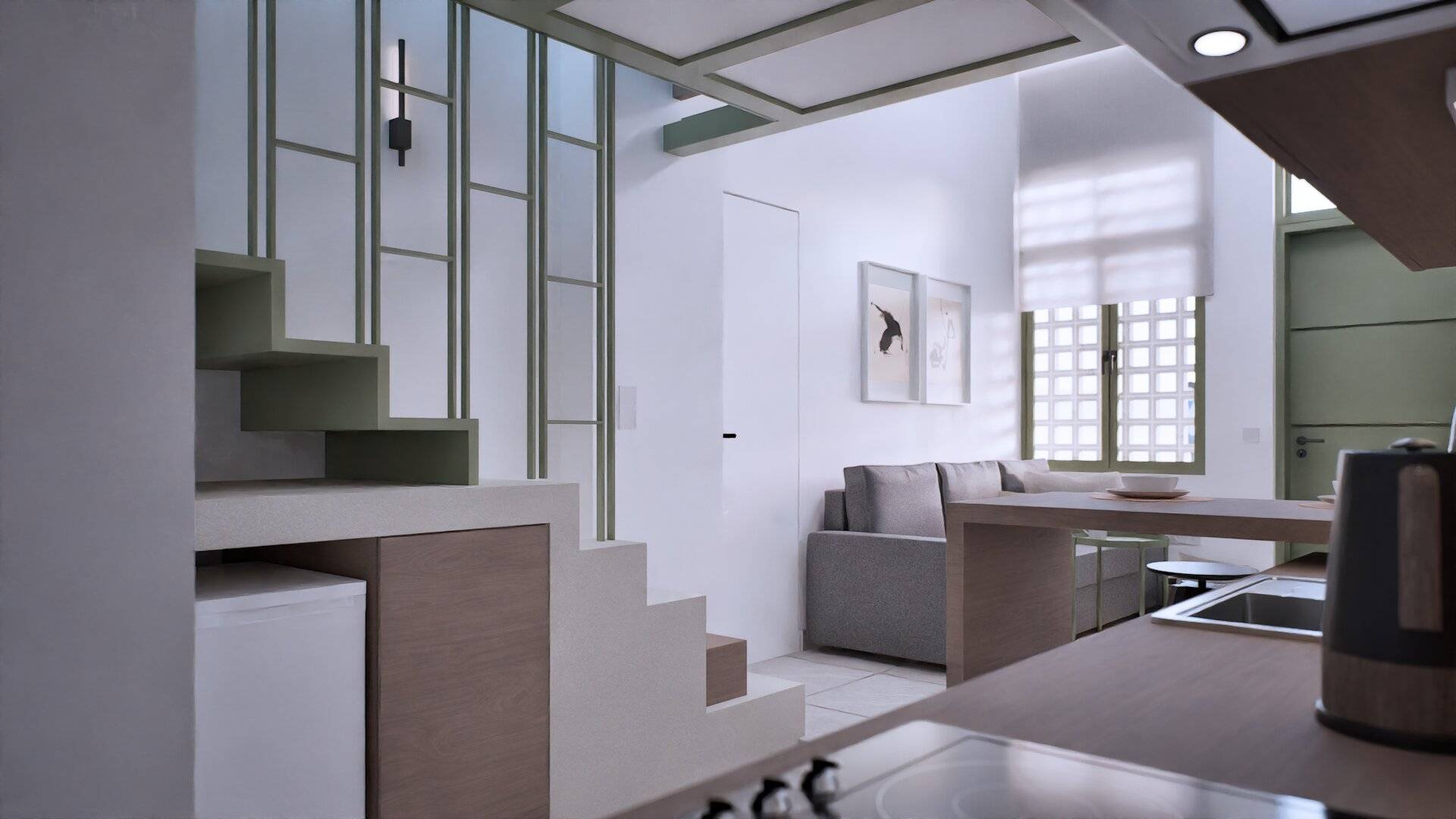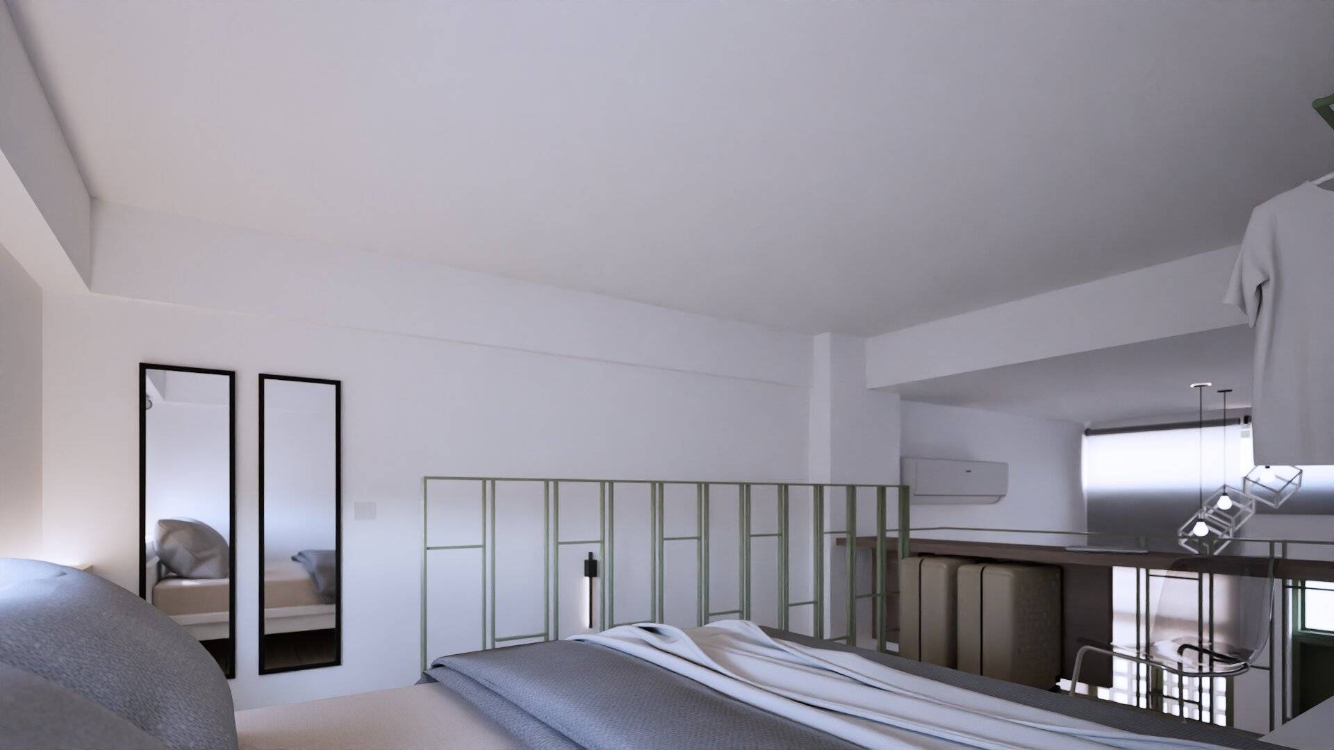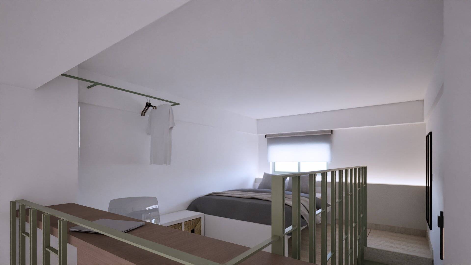 Η σκάλα αποτελεί χαρακτηριστικό στοιχείο: το πρώτο τμήμα της είναι από σκυρόδεμα, σε συνέχεια με τους λευκούς τοίχους, ενώ το δεύτερο είναι μεταλλικό σε πράσινο χρώμα. Οδηγεί στο πατάρι, όπου χωροθετείται το υπνοδωμάτιο με κρεβάτι, ανοιχτή ντουλάπα, διακριτικό γραφείο και έπιπλο αποθήκευσης. Εκεί, κυριαρχούν γήινοι τόνοι με ξύλινο ανοιχτόχρωμο δάπεδο και παράθυρο επάνω από το κρεβάτι.