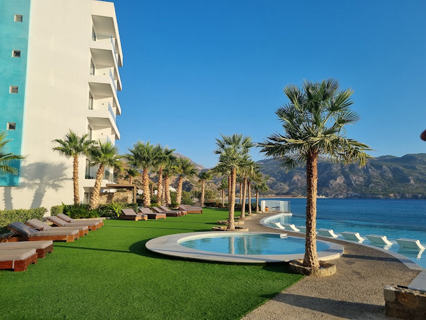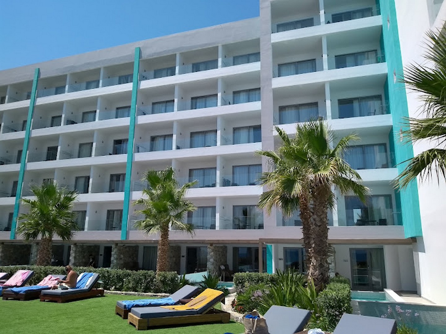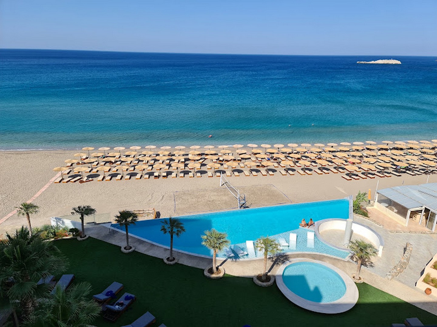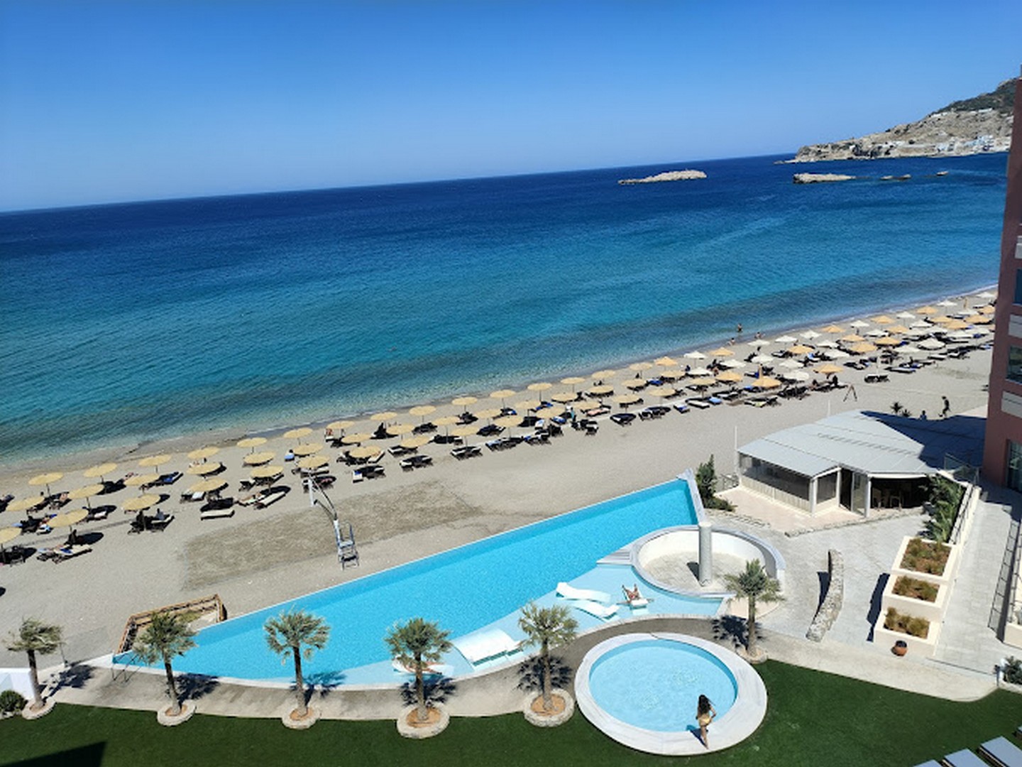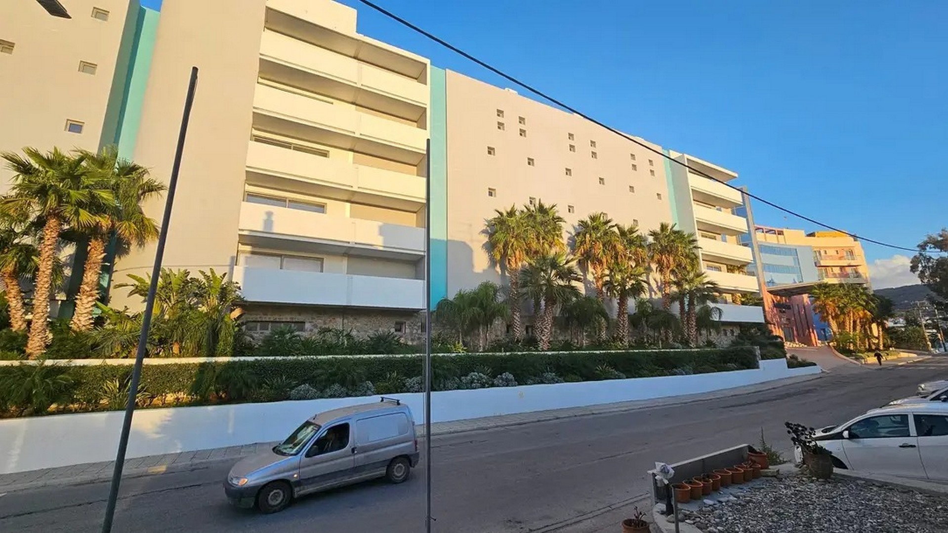 Ο κοινόχρηστος υπαίθριος χώρος αναπτύσσεται στραμμένος προς τη θάλασσα και περιλαμβάνει διαμορφωμένους χώρους πρασίνου, μία μεγάλη και μία μικρότερη πισίνα, δημιουργώντας σημεία συνάντησης και χαλάρωσης μέσα σε ένα τοπίο που ενοποιεί το φυσικό και το τεχνητό περιβάλλον, ενώ ταυτόχρονα σχεδιάστηκε ένας στεγασμένος χώρος μπαρ, άμεσα συνδεδεμένος με την πισίνα.