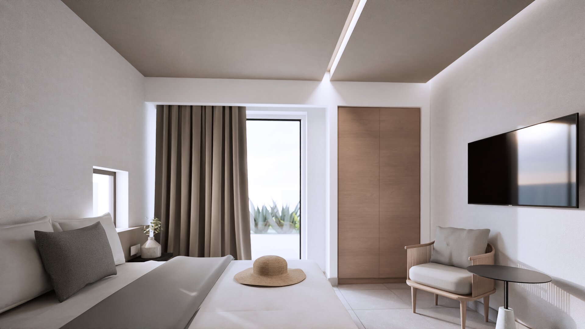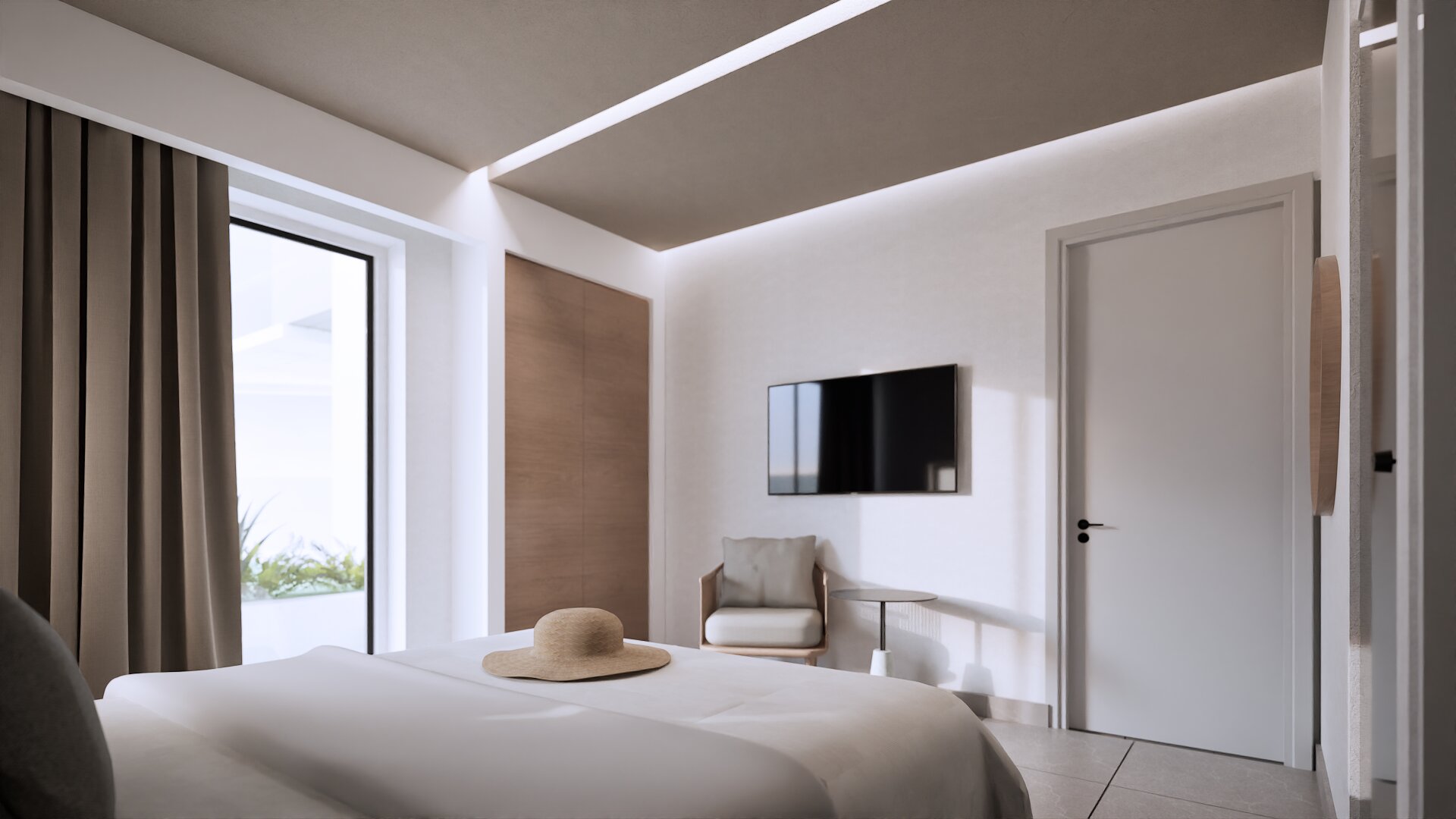 Η αρχιτεκτονική σύνθεση χαρακτηρίζεται κυρίως από λευκούς όγκους, με ορισμένες γκρι επιφάνειες που τονίζουν την καθαρότητα της γεωμετρίας και δημιουργούν ισορροπημένες αντιθέσεις. Ο φυσικός λίθος μιλάτου χρησιμοποιείται επιλεκτικά σε συγκεκριμένα σημεία προσδίδοντας υλικότητα και μία διακριτική σύνδεση με τον τόπο. Το γυαλί και το μέταλλο επιλέχθηκαν ως σύγχρονα στοιχεία που συμβάλλουν στη σαφήνεια και στην καθαρότητα της σύνθεσης.